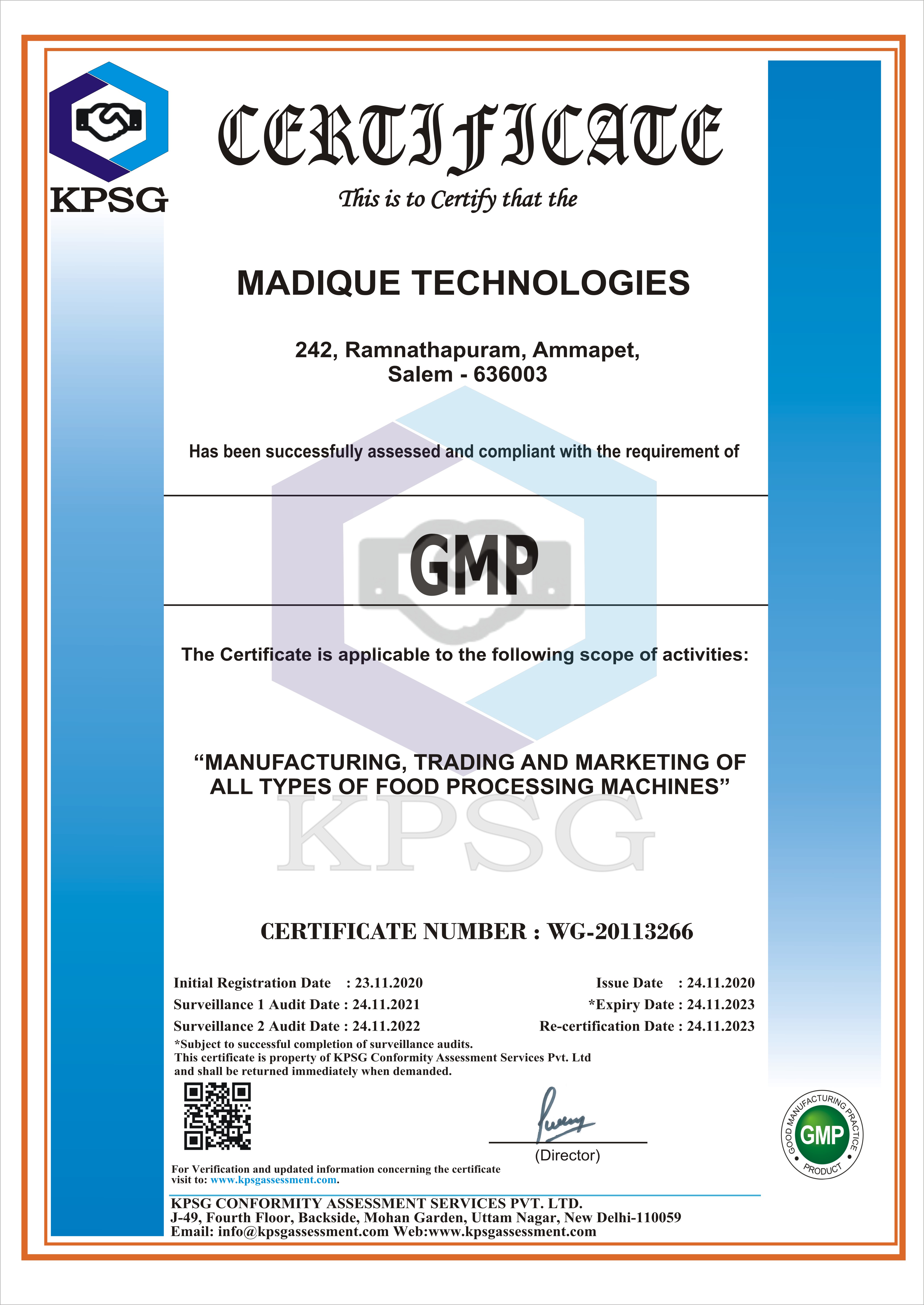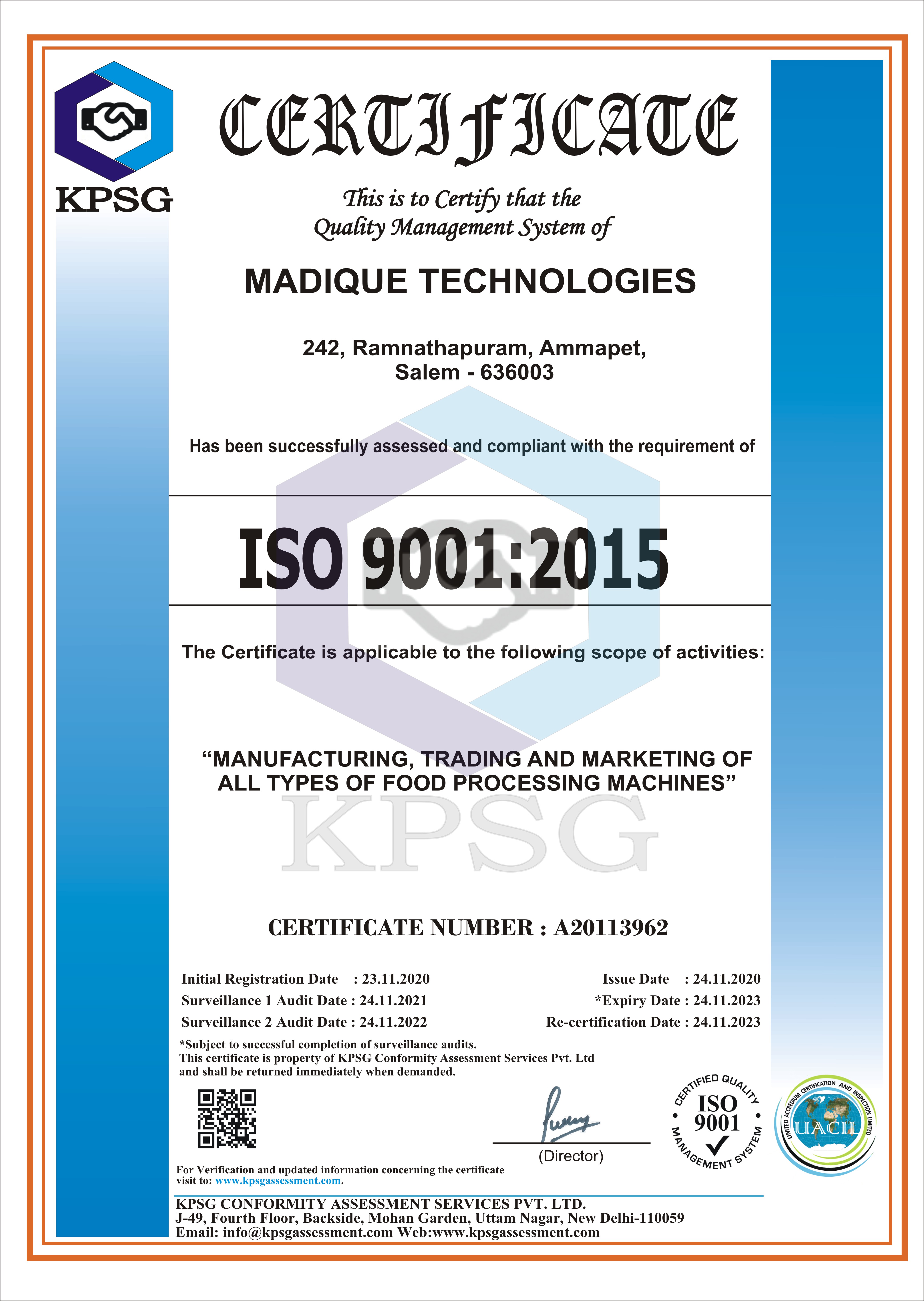 At MADique Technologies, we prioritize quality at every stage of our manufacturing process. From design and material selection to production and testing, each machine undergoes rigorous checks to ensure durability, hygiene, and consistent performance. Our commitment to excellence guarantees that every product meets high industry standards, delivering reliable and efficient food-processing solutions to our customers.